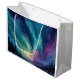 This whimsical gift bag features Aurora-like swirls of teal, violet, and gold over a reflective lake with silhouetted pines - a dreamlike cosmic landscape evoking wonder and renewal. Finished as an oil acrylic paint art print.