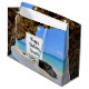 Bolsa de regalo con una fotografía de naturaleza panorámica. Bonito mar azul turquesa con una playa de arena. Una gran roca marrón da sombra al cielo azul intenso.