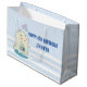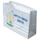 Gran bolsa de regalo con un lindo dinosaurio sonriente, mejillas rosadas y RAWR escrito en su vientre. 3 coloridas estrellas felices sobre su cabeza. Se coloca sobre un patrón azul claro y blanco de puntos y rayas de polka. Personaliza con tu propio texto.