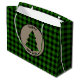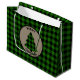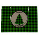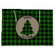 El fondo de esta bolsa de regalo festiva es un patrón de manto de búfalo verde y negro. El frente central tiene una pancarta de color marrón con una imagen de árbol de Navidad revestido de verde y negro. El texto negro dice "Feliz Navidad". La parte trasera de la bolsa tiene la misma imagen, con el texto "Feliz Año Nuevo". Asegúrese de ver los productos que coinciden en nuestra tienda.