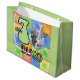 Bolsa de regalo brillante de cal grande con una imagen en la parte delantera de una brillante bola disco, un clásico de los años 70, sobre un colorido fondo pastel de cuadrados fucsia, naranja, azul, verde, violeta y amarillo. Vea la invitación, sobre, bolsa de favores, caja de favores, etiqueta de favor, etiqueta, pegatina cuadrado y papel de envoltura. Vea toda la colección Disco 70s Gift Bag en los TOUCHES ESPECIALES | Sección de favoritos de partido.