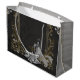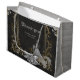 El lujo y el romance. Un marco dorado negro y plateado muy bien diseñado adornado con delicadas decoraciones de fibra. Estos bonitos detalles le dan al diseño un toque opulento y envuelven al espectador con una sensación de alegría festiva. Dentro de este marco mágico, una mujer se revela con un impresionante vestido boda. El diseño exuda un aura de exclusividad y calidez