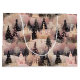A delicate pink and black pattern with snowy hills and ethereal village buildings among elegant pink and black pine trees.