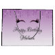 Bolsa de regalo de feliz cumpleaños con un diseño moderno y elegante. El fondo es un color de gradiente morado con una imagen de un purpurina chispeante que gotea desde la parte superior. Un par de pestañas lindas y niñitas debajo de la imagen del purpurina.