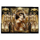 Una hermosa morena Flapper chica lleva puesto un lustre dorado y una cabecera que parecen brillar y brillar sobre un fondo negro. Lleva un delineador negro grueso y un pintalabios rojo oscuro que hacen que su piel de porcelana parezca irradiarse en la luz y está enmarcada en un marco retro, de estilo art decó ornamentado con un marco de oro falso. La están parpadeando tres glamorosas bailarinas flapper en vestidos de satén dorado abrazando figuras. Están subiendo a un escenario a punto de bailar toda la noche. Este diseño es ideal para un "gran gatsby", "roaring twenties", cumpleaños temática Flapper chica de los años 20, ducha de novia, boda o aniversario. También es ideal para proyectos de desconexión y de reserva de recortes.