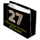 Este sencillo y divertido diseño de bolsos de regalo de cumpleaños con temática de Navidades y cumpleaños, el 25 de diciembre, incluye un gran número "27" con un patrón de rayas verdes, blancas y rojas, junto con el mensaje "Feliz cumpleaños 27 y Feliz Navidad", y un nombre de personalizable. El fondo es negro de color. Una bolsa de regalo como esta podría ser usada para envolver regalos o regalos que se le están dando a alguien cuyo 27 cumpleaños cae el 25 de diciembre (Día del Navidad). [~Z0000407]