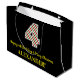 Este sencillo y divertido diseño de bolsos de regalo de cumpleaños con temática de Navidades y cumpleaños 25 de diciembre cuenta con un gran número "4", con un patrón de rayas rojas/blancas/verdes. También incluye el mensaje "Feliz cuarto cumpleaños y Feliz Navidad", y un nombre personalizado. El fondo es negro de color. Una bolsa de regalo como esta puede ser divertida de usar cuando se envuelven regalos o regalos que se le están dando a alguien cuyo cuarto cumpleaños cae el 25 de diciembre (Día del Navidad). [~Z0000407]