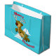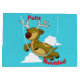 Feliz Navidad - Feliz Navidad Flying Reindeer, bolsa de regalo personalizada con su lindo reno sonriente y texto en inglés y español: Feliz Navidad y Feliz Navidad, todo con un brillante fondo azul. Personaliza cualquiera o todo este bolso de regalo: imágenes, texto, color de fondo.