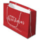 Bolsa de regalo de Navidad Moderna y Roja con la frase 'Feliz Navidad' en blanco estilo de escritura moderno con el nombre familiar en blanco moderno sans serif estilo fuente en rojo.