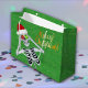 Esta bolsa de regalo es verde con motas de oro brillante y un esqueleto sosteniendo brillantes adornos hasta los ojos usando un gorra rojo de Santa Claus con texto navideño Feliz con brillantes letras de oro en la parte delantera y trasera.
