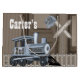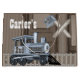 Diseño rústico y único con temática de tren, con la imagen de una vintage cabaña de ferrocarril como fondo junto con la locomotora original, las vías del ferrocarril y el cartón de travesía del ferrocarril, con el gorro de los conductores colgando del cartel. Ilustracion original, fotografía y diseño de Holiday Hearts Designs (todos los derechos reservados). Si necesita ayuda para personalizar este diseño para su ocasión, por favor envíenos un correo electrónico a info@holidayheartsdesigns.com.