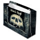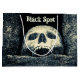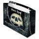 Calavera blanca sonriente sobre el fondo negro u oscuro. El texto Black Spot sobre el cráneo. Personalizable Halloween gran bolsa de regalo para cualquiera. Puede cambiar la imagen y puede cambiar o eliminar el texto. A los piratas se les presentó un Black Spot para pronunciar oficialmente un veredicto. Diviértete y Feliz Halloween.