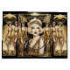 A beautiful blonde hair Flapper girl is wearing an off-shoulder faux gold shimmer top and headband that appear to sparkle and shine against a black background. She is wearing thick black eyeliner and dark red lipstick that makes her porcelain skin appear to radiate in the light and is framed a retro, art deco style ornate faux gold frame. Flanking her are three glamorous flapper dancers in satin gold figure-hugging dresses. They are stepping onto a stage about to dance the night away. This design is ideal for a "great gatsby", "roaring twenties", 1920's Flapper girl theme birthday, bridal shower, wedding or anniversary. It is ideal for decoupage and scrapbooking projects too.