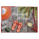 Esta postal de bienvenida de Warmest Wshes Beach incluye un bonito par de chanclas naranjas y gorra solar. Hay conchas y una palmera acuarela decorada con luces de cuerda de árbol de Navidad, todo ello sobre un fondo de madera.