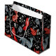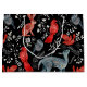 Illustrated black background features patterned red and blue birds, a rabbit, and a deer among white floral designs, creating a whimsical, folk-art style.