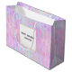 Bolsa de regalo con un patrón de fondo abstracto. Las acuarelas rosas moradas y azules componen este diseño artístico que presenta formas rectangulares verticales sobre un fondo suave de mosaico. Un cuadrado sobre la parte superior con un falso borde de Relieve metalizado dorado, tu texto personalizado dentro.