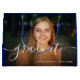 Bolso de fotos azul clásico con la palabra graduada en escritura y nombre/clase de detalles abajo.