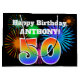 Este divertido y vibrante diseño de bolsos de regalo presenta un patrón colorido inspirado en fuegos artificiales de celebración, junto con el número "50" que presenta un patrón gradiente inspirado en el arcoiris multicolor, sobre un fondo de color negro. También incluye un nombre de personalizable y un mensaje de evento, como un saludo de cumpleaños. Una bolsa de regalo colorida como esta podría ser usada cuando se envuelve un regalo o regalo que se está regalando en celebración del cincuentenario de alguien. [~Z0000328]