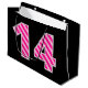 Un lado de este divertido y sencillo diseño de bolsos de regalo con temática de cumpleaños tiene un gran número "14" con un patrón de rayas rosa oscuro y rosa claro. El otro lado presenta el mensaje de bienvenida de cumpleaños "Feliz cumpleaños 14", y un nombre editable, ambos en texto de color amarillo. El fondo es negro de color. Bolsas de regalo como esta podrían ser usadas al envolver regalos o regalos que se dan a alguien que está celebrando su decimocuarto cumpleaños. [~Z0000378]