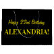 Un lado de este divertido y sencillo diseño de bolsos de regalo con temática de cumpleaños tiene un gran número "22" con un patrón de rayas rosa oscuro y rosa claro. El mensaje de bienvenida de cumpleaños "Feliz cumpleaños número 22", y un nombre de personalizable aparecen en el otro lado, ambos en texto de color amarillo. El fondo es negro de color. Una bolsa de regalo como esta podría ser usada para envolver regalos o regalos que se le dan a alguien que está celebrando su vigésimo segundo cumpleaños. [~Z0000378]