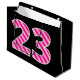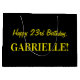 Un lado de este divertido y sencillo diseño de bolsos de regalo con temática de cumpleaños tiene un gran número "23" con un patrón de rayas rosa oscuro y rosa claro. El otro lado tiene el mensaje de bienvenida de cumpleaños "Feliz cumpleaños 23", y un nombre editable, ambos en texto de color amarillo. El fondo tiene un color negro. Una bolsa de regalo como esta puede ser usada para envolver regalos o regalos para celebrar el 23 cumpleaños de alguien. [~Z0000378]