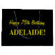 Un lado de este divertido y sencillo diseño de bolsos de regalo con temática de cumpleaños tiene un gran número "75" con un patrón de rayas rosa oscuro y rosa claro. El otro lado tiene el mensaje de bienvenida de cumpleaños "Feliz cumpleaños 75", y un nombre personalizado, ambos en texto de color amarillo. El fondo es negro de color. Bolsas de regalo como esta podrían ser usadas cuando se envuelven regalos o regalos a alguien que está celebrando su cumpleaños setenta y cinco. [~Z0000378]