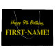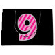 Un lado de este divertido y sencillo diseño de bolsos de regalo con temática de cumpleaños tiene un gran número "9" con un patrón de rayas rosa oscuro y rosa claro. El otro lado tiene el mensaje de bienvenida de cumpleaños "Feliz noveno cumpleaños", y un nombre editable, ambos en texto de color amarillo. El fondo es negro de color. Bolsas de regalo como esta pueden ser usadas cuando se envuelven regalos o regalos para celebrar el noveno cumpleaños de alguien. [~Z0000378]