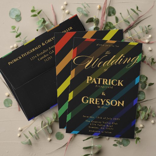 Celebrate your love with the Gay Men Wedding Elegant Rainbow collection — a complete suite of coordinating stationery and accessories designed for two grooms. Bold diagonal Progress Pride stripes on sophisticated black, with gold typography throughout. Every piece in this suite is fully customizable with your names, date, and wedding details.