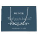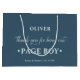 Bolsa de regalo de PAGE BOY personalizada con paleta de color azul y azul celeste. La plantilla de nombres está preparada para que añada el nombre del niño de la página, así como los nombres de la novia y del novio y la fecha del boda. La frase de agradecimiento dice "Gracias por ser nuestro chico de la página" en una mezcla de escritura elegante y tipografía fuerte y audaz. Por favor, busque en nuestra tienda colores y tamaños alternativos.