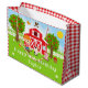 Esta tierna y divertida bolsa de regalo puede ser personalizada con un nombre o título como hijo, nieto, sobrino, amigo, etc. Cuenta con un peinado rojo con piel clara al lado de un granero rojo con una veleta de gallo. Hay animales de granja adorables como una vaca, un cerdo y una gallina. En el fondo hay un cielo azul brillante, manzanos, sol, mariposas y margaritas.