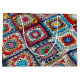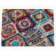 Los cuadrados de granito de crochet multicolor están dispuestos en una cuadrícula cada uno con un patrón único de formas concéntricas