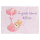 Una bolsa de regalo con un adorable ilustracion de un pequeño conejito marrón que lleva una pequeña corona dorada. Llevado por globos en una manta rosa de corazón.