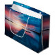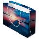 Bolsa de regalo con una preciosa fotografía. Un lugar pintoresco. Un bonito lago tranquilo con un pontón de madera que se extiende hacia el exterior. La puesta de sol aporta hermosos colores al cielo, rojo vivo y azul.