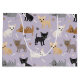 Perros de chihuahua lindo con abrigos negros, marrones, tan, crema, grises y azules sentados y parados con huesos de perro dispersos y huellas de pata sobre un fondo morado claro.