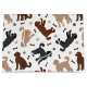 Los labradores cortos en abrigos marrones, negros y tostados se sientan, se paran y se ponen con huesos de perro dispersos y huellas de pata sobre un fondo blanco.