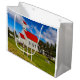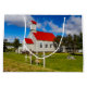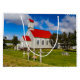 Tradicional iglesia islandesa con tejado rojo y rodeada de césped, algunos árboles y algunas cruces.