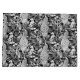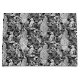 Patrón Art Nouveau basado en un tejido inspirado en los tejidos de William Morris vintage que representa una escena forestal con pavos reales, arcos y zorros, digitalmente representada en blanco y negro