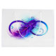 Símbolo infinito con una hermosa pluma pintada de color violeta y azul brillante sobre fondo blanco.