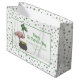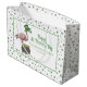 These festive Irish Shamrock Pink Flamingo St Patricks Day Large Gift Bag feature my playful pink flamingo wearing an oversized leprechaun hat beside a pot of gold coins, beautifully displayed inside a rectangular frame with your event details.