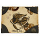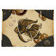 La maravilla mecánica del pez vapor del océano. El estilo steampunk presenta detalles intrincados en negro y oro. El pez está rodeado de engranajes y burbujas, contrastando con un fondo de pergamino envejecido y texturado. Las esquinas de la imagen están enmarcadas con materiales y esferas oscuros, metálicos, perforados. La estética general es una mezcla de elementos mecánicos y orgánicos, creando un ambiente de fantasía.