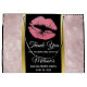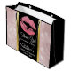 Bolsa de regalo de fiesta (o cualquier otro evento) con un fondo compuesto por un patrón moderno y trendy de hojas tropicales de oro rosa. Superpuesto en la parte superior hay un marco negro con un borde de gradiente dorado, dentro hay labios brillantes rosados.