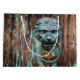Esta imagen de primer plano muestra un apasionante timbre que representa la cabeza de un león, con grano de madera, rayas oscuras, nudos y astillas de pintura turquesa en el fondo, todo lo cual contribuye de manera bella a su encanto rústico y a su encanto natural. Este diseño atemporal recuerda a la artesanía del viejo mundo y le da un toque de calidez y carácter a cualquier decoración. La pintura descolorida de la madera realza este efecto al crear un aspecto texturado y de capas que evoca la historia y las historias que contiene sus fibras. Un diseño de este tipo introduce un sentimiento de naturaleza y tranquilidad. Con sus tonos tierra y su autenticidad, este tipo de hogar y acento viviente transforma su espacio en un refugio sereno, combinando elementos naturales y estética.