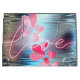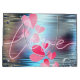 Love Shimmer es un diseño con la palabra amor sobre varias formas cardíacas de colores rosas sobre un fondo azul plateado con adornos purpurinoso. Un regalo perfecto para celebrar el amor en el El día de San Valentín o en cualquier otro día.