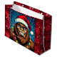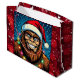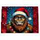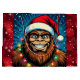 A funny comic book style pop art Bigfoot Christmas gift bag with a comic book style pop art sasquatch smiling with a Santa and Christmas lights on.