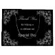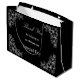 Este singular marco ordenado y una gran bolsa de regalo para el Día de la Boda hacen un recuerdo ideal para presentarle a sus invitados en su día especial con un regalo en el interior (¿un trozo de pastel de Boda tal vez?). Haz que tu día especial sea mejor con este diseño de moda. El diseño presenta un gráfico floral blanco ornamentado en cada esquina, con un pequeño gráfico de ramo dentro de una decoración ornamental. Los colores de fondo y todo el texto se pueden cambiar para adaptarlos a sus necesidades.