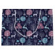 A modern abstract pattern with white deer leaping and prancing against a night blue background filled with turquoise blue and purple trees.