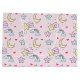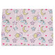 Un adorable patrón con estrellas felices, luna, nubes y arcos sobre un suave fondo rosa pastel.