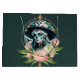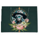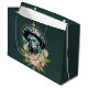 Mujer asombrosa adornada con un impresionante maquillaje de cráneo de azúcar. Los colores brillantes y los intrincados patrones cuentan historias de vida y muerte, dándole una mirada alegre y respetuosa que es perfecta para el Día de los Muertos. Su cabello largo y fluido resplandece un turquesa brillante que fluye sobre sus hombros como una cascada de color. Capta la luz y realza el ambiente festivo del diseño. El fondo brilla en tonos azules y verdes que recuerdan a un cielo nocturno, mientras que delicadas flores rosas y blancas bailan a su alrededor. Estos acentos florales no sólo agregan color, sino que también simbolizan el amor y el recuerdo de los fallecidos.