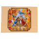 Un pájaro volador, una margarita azul, una garbanza, una nalga y un cardenal se reúnen en un alimentador de aves para una fiesta de otoño, en un fondo naranja de color ocaso. Obra de arte creada a partir de una pintura original de la artista de vida silvestre Crista S. Forest.