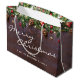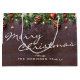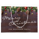 Bolsa de regalo de navidad personalizado con fondo de madera oscura, ramas de árboles de navidad festiva, decoración de árboles rojos y dorados, conos de pino y luces de cuerda.